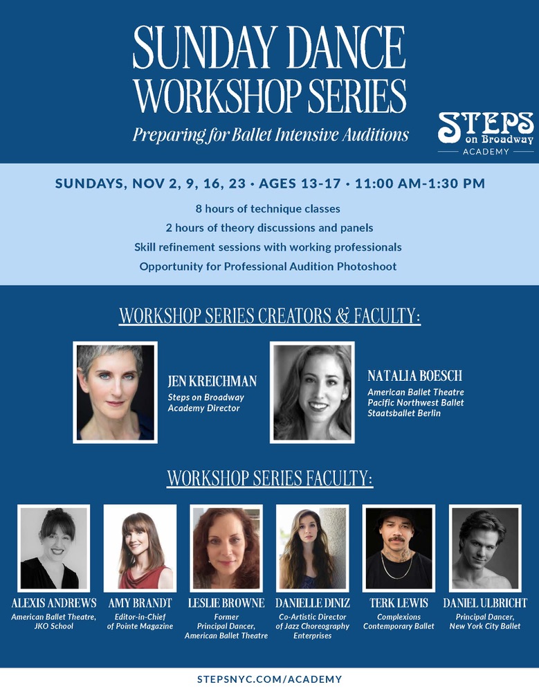 Natalia created this workshop series in collaboration with Jennifer Kreichman, Director of the Steps on Broadway Academy, and Danielle Diniz, Freelance Choreographer and Teacher, to help young dancers prepare for Summer Intensive Auditions.